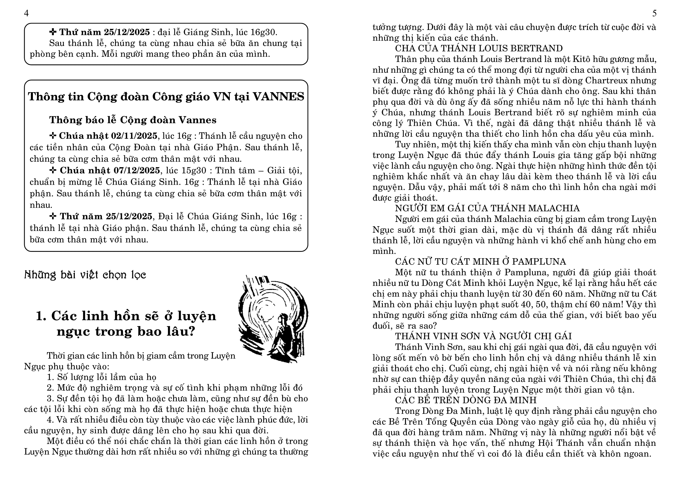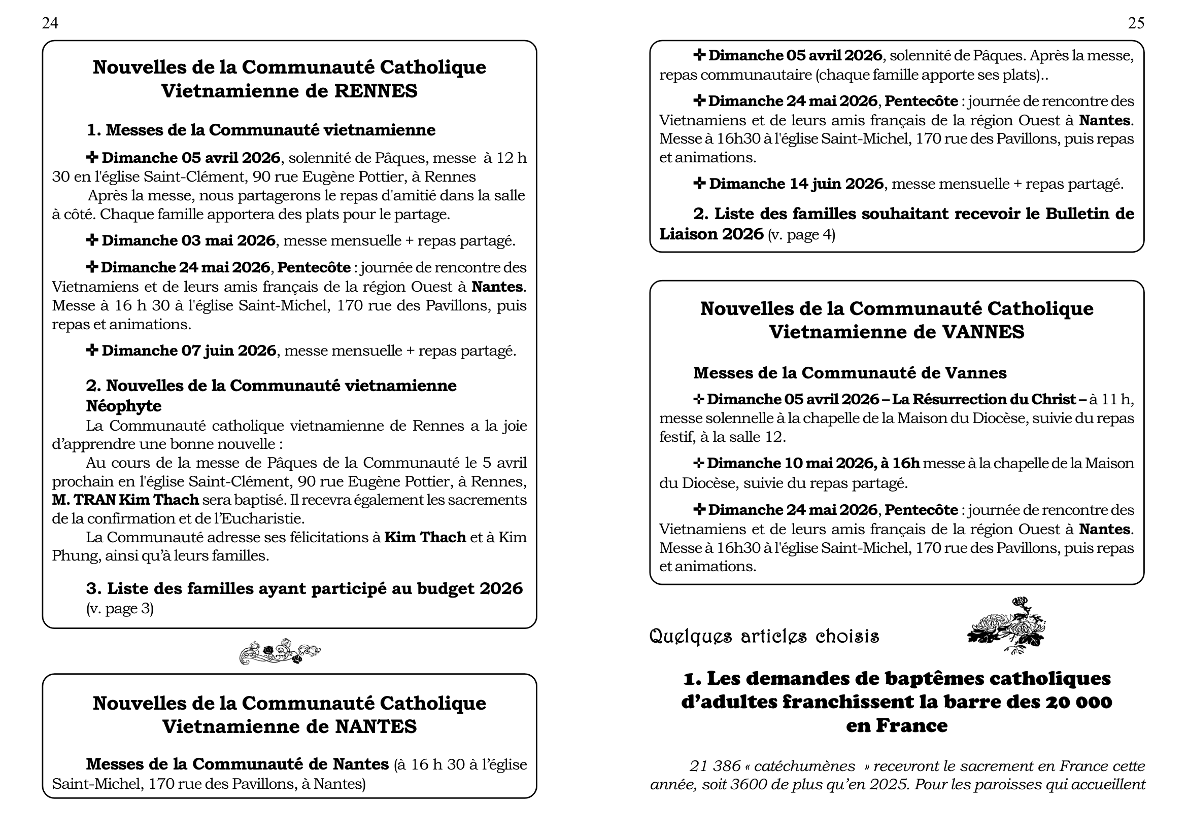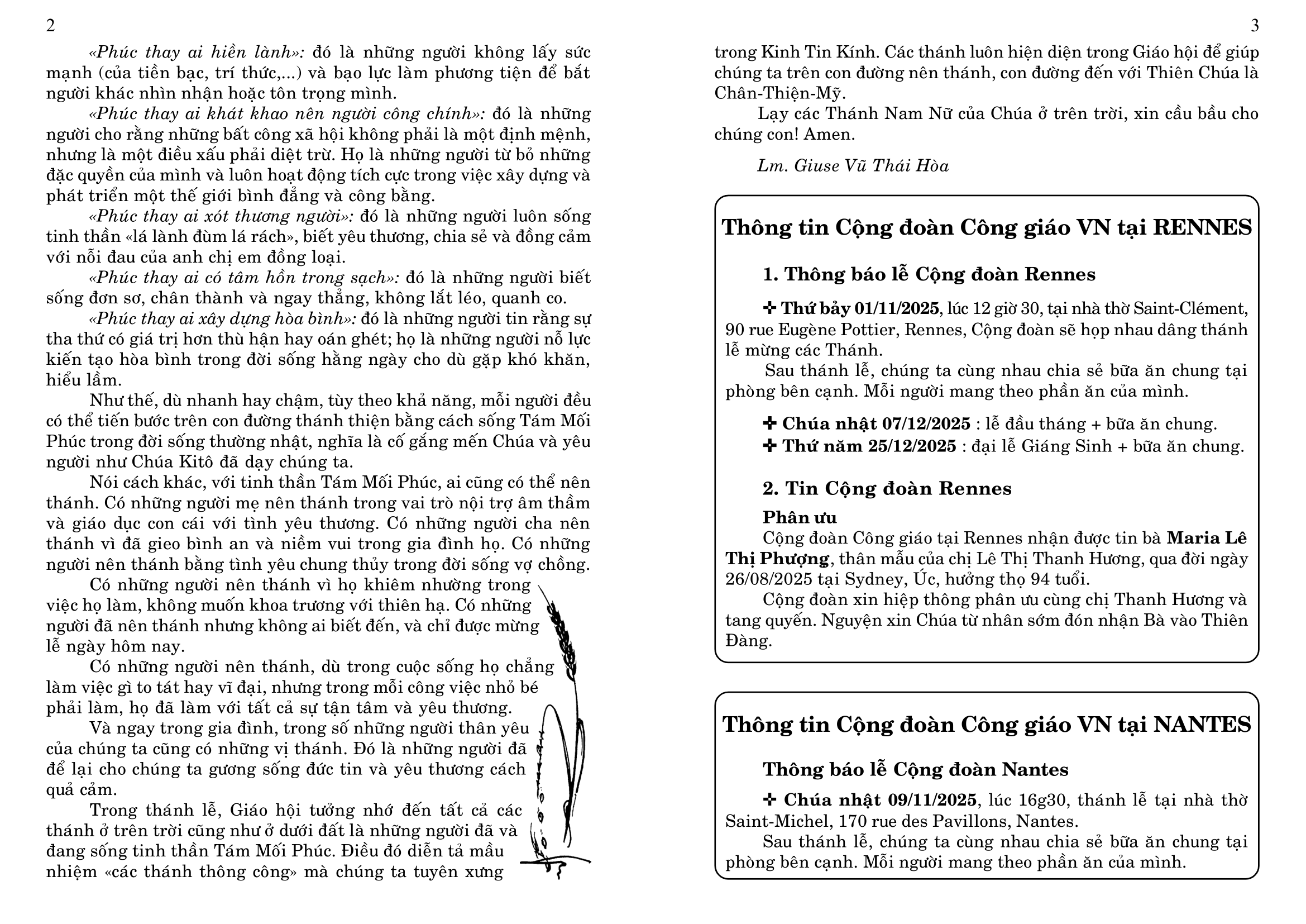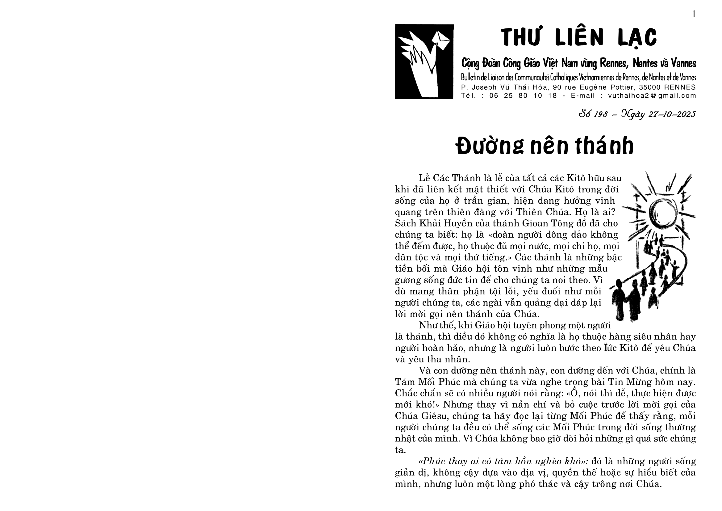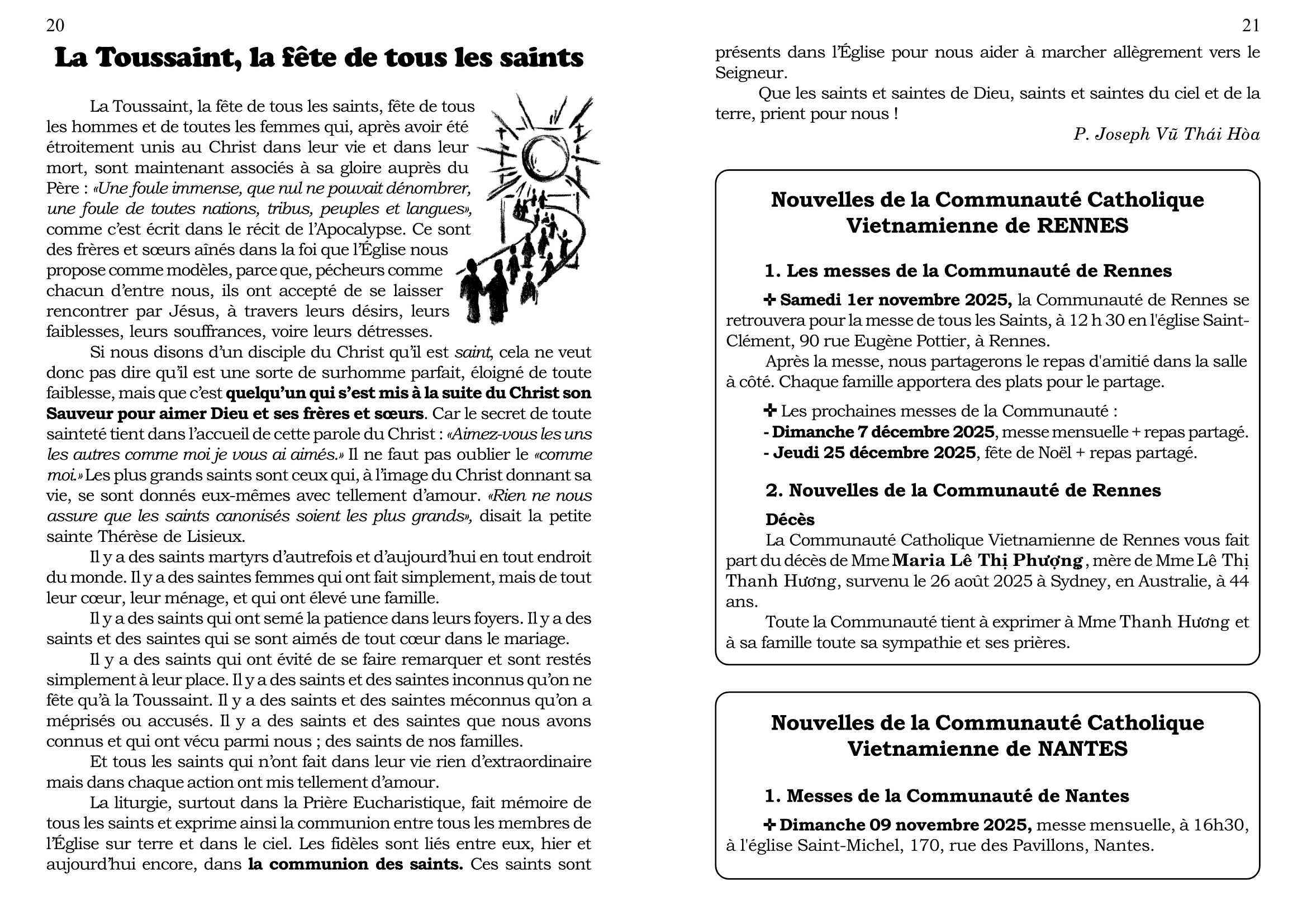 4. Tham dự ngày họp mặt của người Việt vùng Tây Pháp, tại Nhà Địa Phận của Vannes, mỗi năm một lần, thường vào tháng 6, do các Cộng đoàn Công Giáo Việt Nam vùng Tây Pháp tổ chức (Rennes, Nantes, Brest, Saint Brieuc và Vannes), nhưng dành cho mọi người Việt, không phân biệt tôn giáo, và cho các thân hữu người Pháp. Sau Thánh Lễ dành cho giới Công Giáo, có bữa cơm chung cho tất cả mọi người, và sinh hoạt văn nghệ cho tới chiều.
