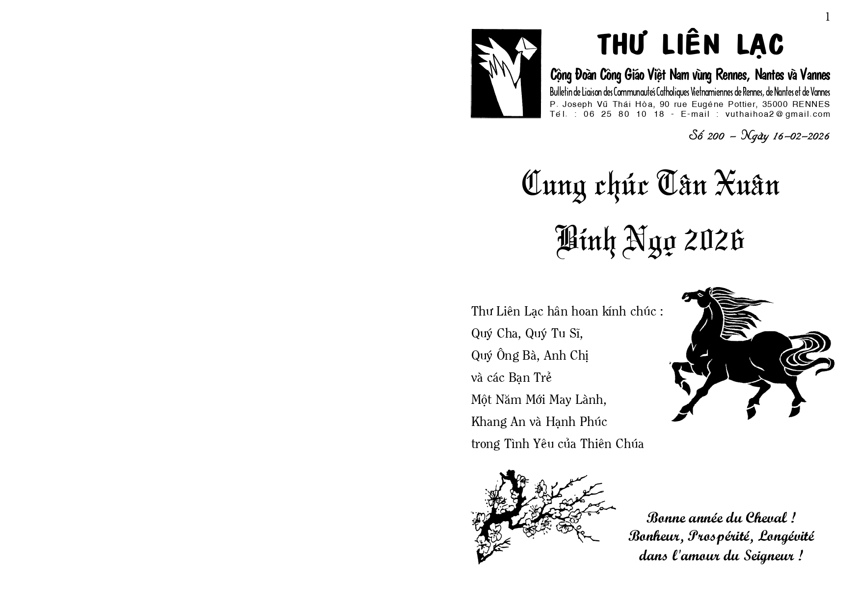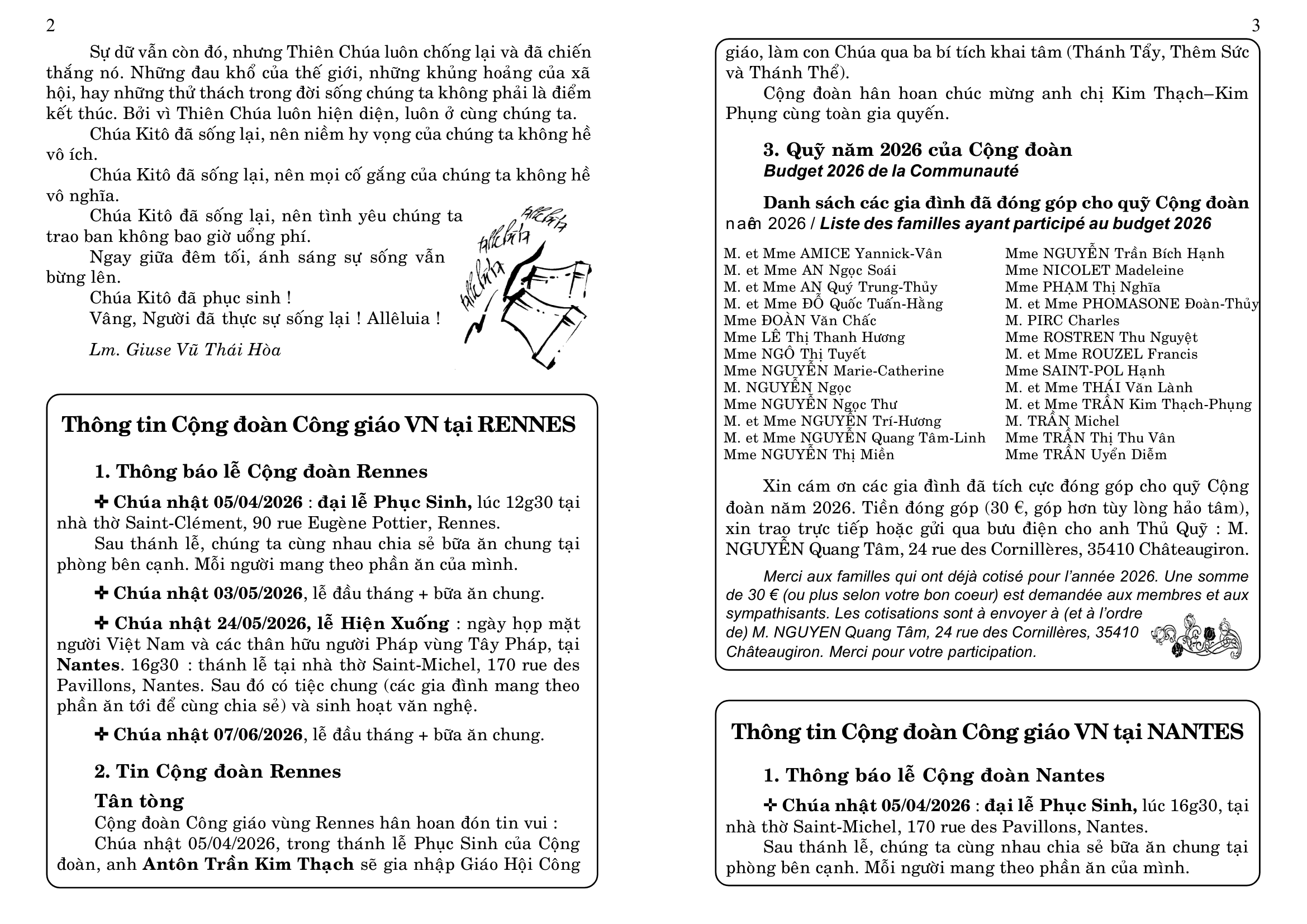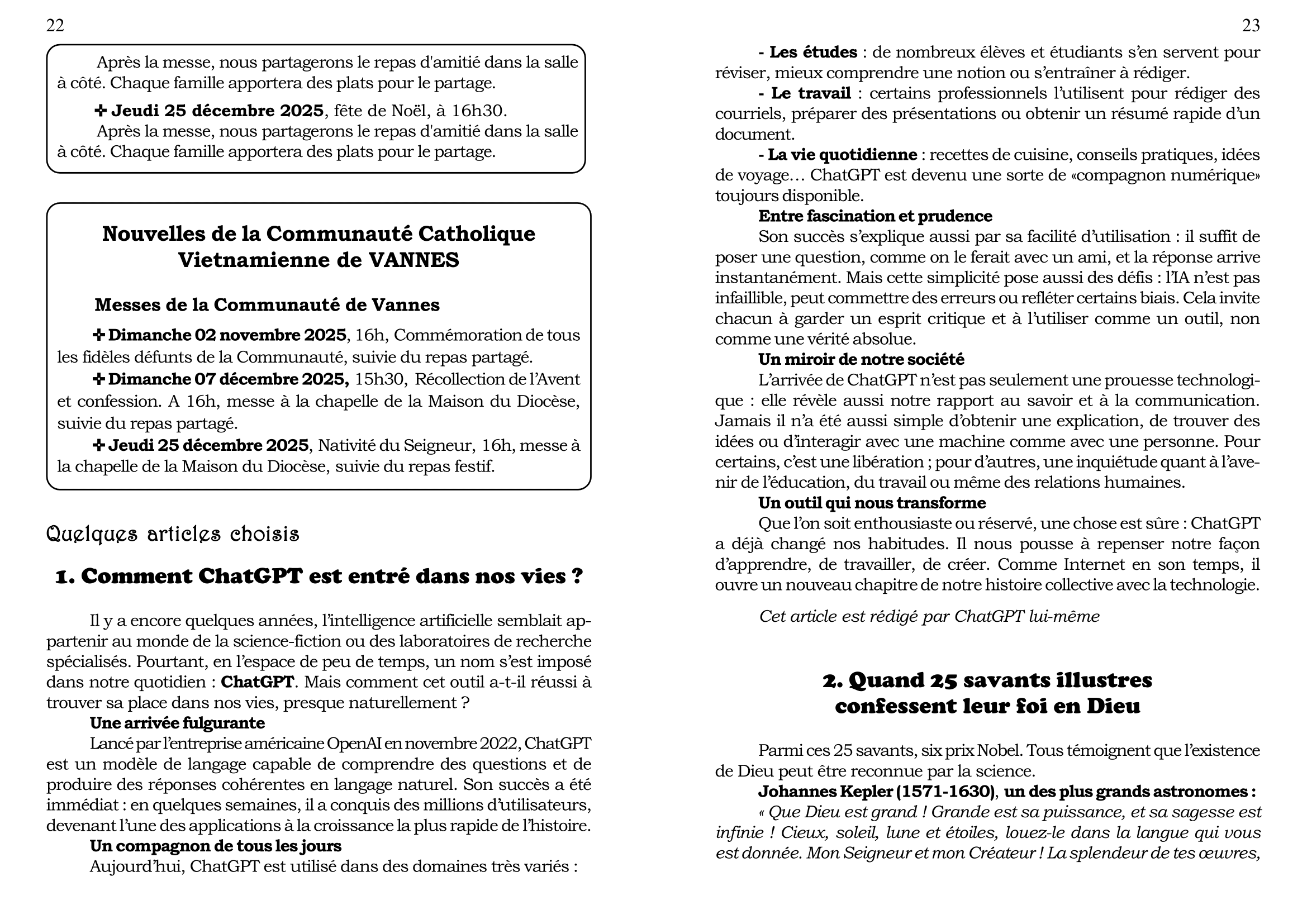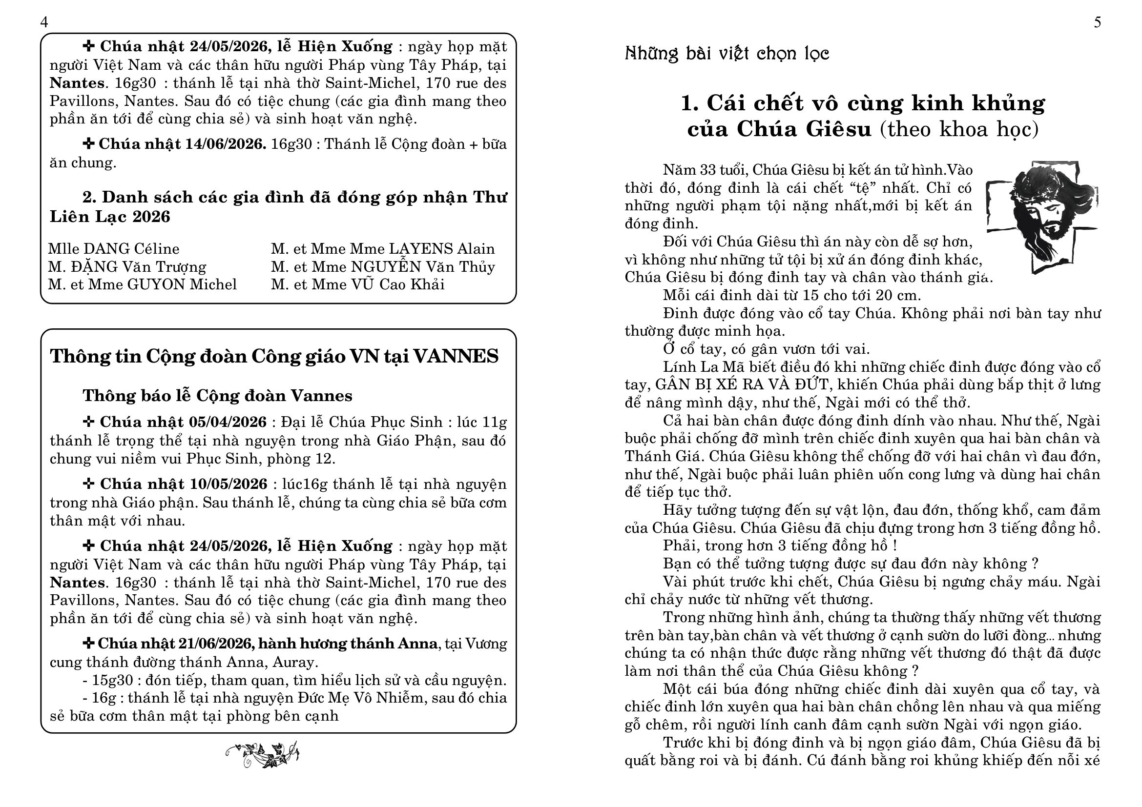 4. Tham dự ngày họp mặt của người Việt vùng Tây Pháp, tại Nhà Địa Phận của Vannes, mỗi năm một lần, thường vào tháng 6, do các Cộng đoàn Công Giáo Việt Nam vùng Tây Pháp tổ chức (Rennes, Nantes, Brest, Saint Brieuc và Vannes), nhưng dành cho mọi người Việt, không phân biệt tôn giáo, và cho các thân hữu người Pháp. Sau Thánh Lễ dành cho giới Công Giáo, có bữa cơm chung cho tất cả mọi người, và sinh hoạt văn nghệ cho tới chiều.