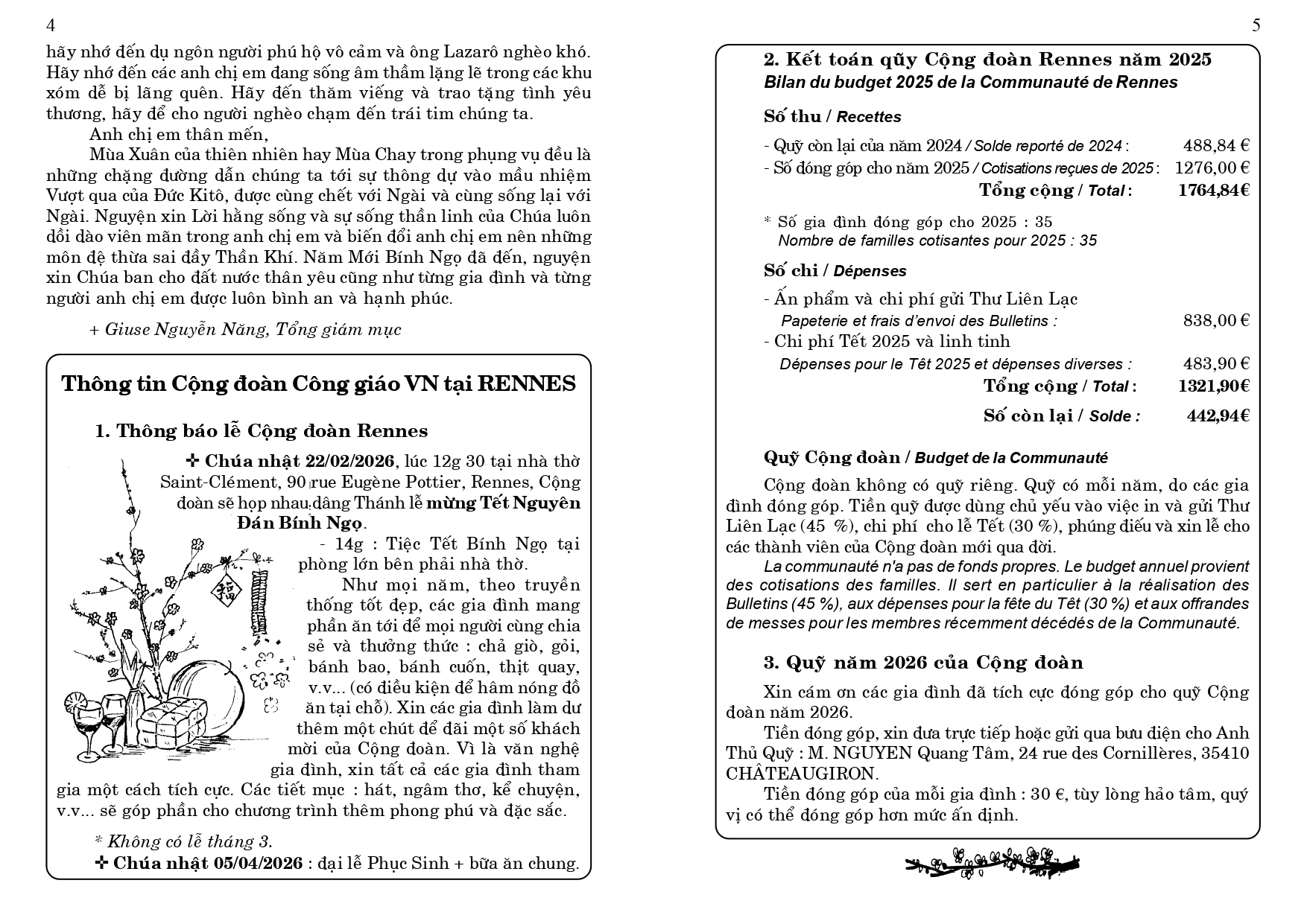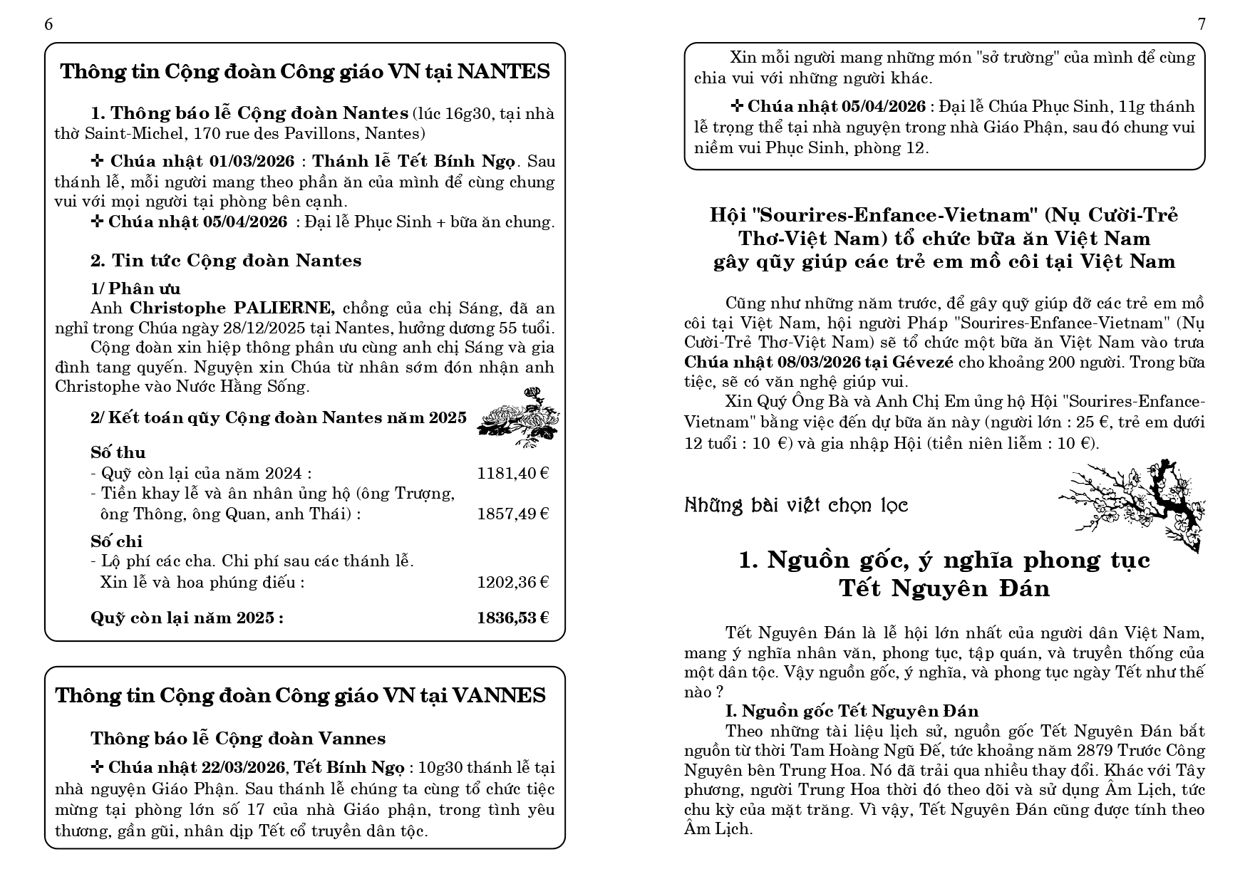 2. Mừng Tết Nguyên Đán. Các thành viên Cộng đoàn tự do mời một số bạn bè ngoài công giáo, những thân hữu người Pháp và một số anh chị em sinh viên Việt Nam. Rennes là một thành phố thường tiếp đón và bảo trợ các bác sĩ, kỹ sư Việt Nam qua tu nghiệp. Cộng đoàn không quên mời các anh chị em đồng hương này đến mừng Tết, vì vào dịp này, thường buồn vì nhớ nhà...
