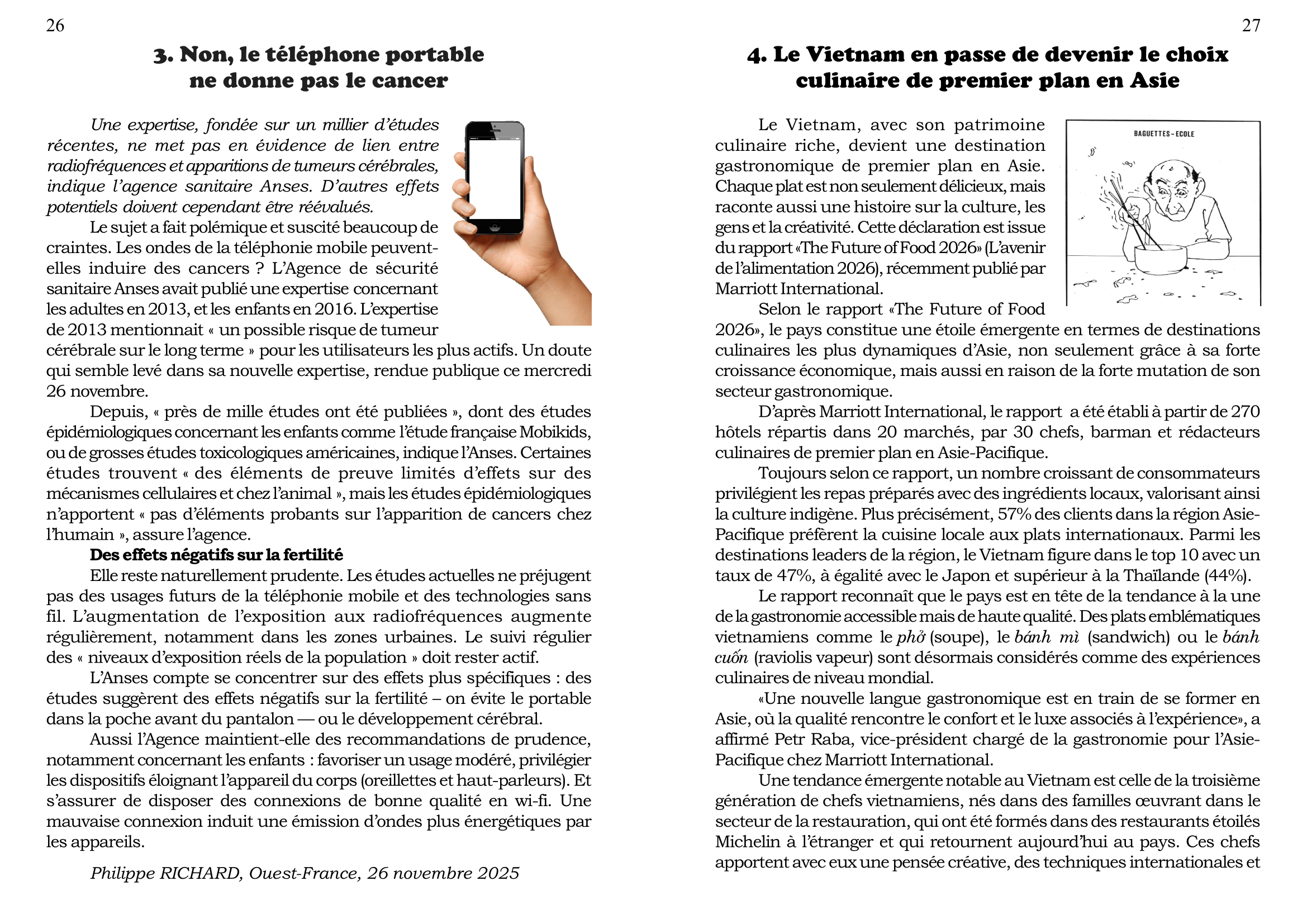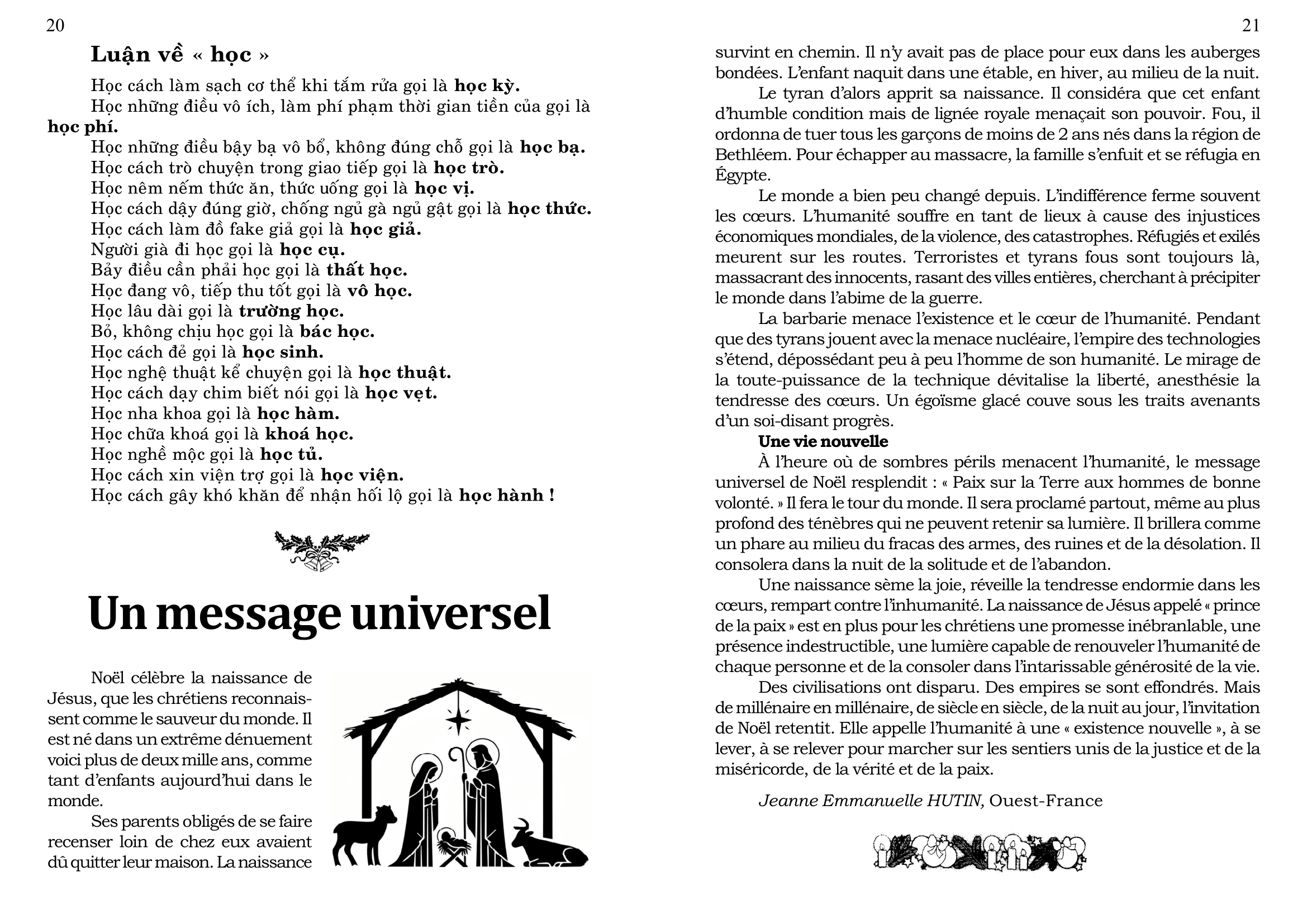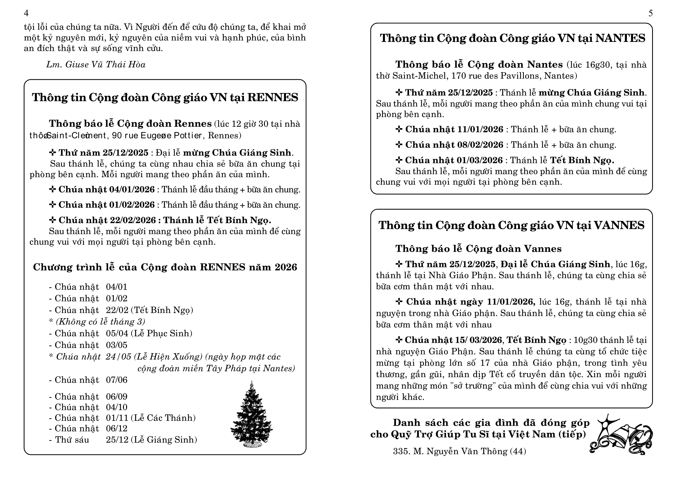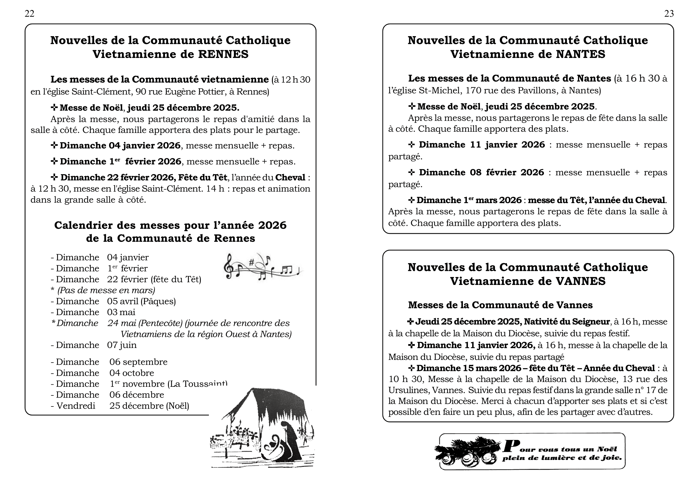 4. Tham dự ngày họp mặt của người Việt vùng Tây Pháp, tại Nhà Địa Phận của Vannes, mỗi năm một lần, thường vào tháng 6, do các Cộng đoàn Công Giáo Việt Nam vùng Tây Pháp tổ chức (Rennes, Nantes, Brest, Saint Brieuc và Vannes), nhưng dành cho mọi người Việt, không phân biệt tôn giáo, và cho các thân hữu người Pháp. Sau Thánh Lễ dành cho giới Công Giáo, có bữa cơm chung cho tất cả mọi người, và sinh hoạt văn nghệ cho tới chiều.